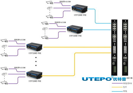如圖所示:監(jiān)控系統(tǒng)的前端全部采用網(wǎng)絡(luò)高清攝像機(jī);接入端傳輸設(shè)備選用優(yōu)特普網(wǎng)電速聯(lián)7系PoE交換機(jī)UTP7208E-PoE;匯聚端則采用優(yōu)特普28口千兆模塊化網(wǎng)絡(luò)交換機(jī)UTP7524GE;接入端和匯聚端的交換機(jī)根據(jù)距離的不同合理選擇網(wǎng)線和光纖進(jìn)行網(wǎng)絡(luò)高清視頻信號(hào)的傳輸。