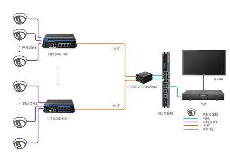 下圖顯示了這個網(wǎng)絡(luò)高清監(jiān)控的傳輸方案,主要應(yīng)用到了優(yōu)特普“網(wǎng)電速聯(lián)”產(chǎn)品:4口和8口PoE網(wǎng)絡(luò)交換機(jī)進(jìn)行數(shù)據(jù)交換和電/光轉(zhuǎn)換。
