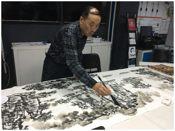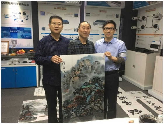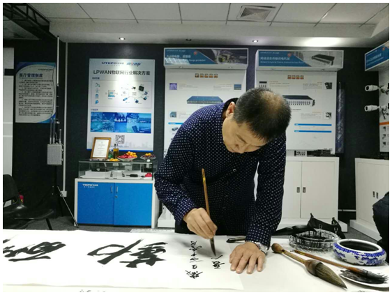 在優(yōu)特普董事長(zhǎng)聶懷東的陪同下,中組部黨建辦領(lǐng)導(dǎo)及老師們參觀了優(yōu)特普公司及展廳。看見(jiàn)優(yōu)特普公司墻上掛著的書(shū)法和國(guó)畫(huà)作品,兩位老師一時(shí)興起,在展廳當(dāng)場(chǎng)揮毫潑墨,作起書(shū)畫(huà)來(lái)。老師們高深的藝術(shù)造詣和精美的書(shū)畫(huà)作品,讓優(yōu)特普人大開(kāi)眼界。能如此近距離欣賞大師們的風(fēng)采,實(shí)在是機(jī)會(huì)難得!