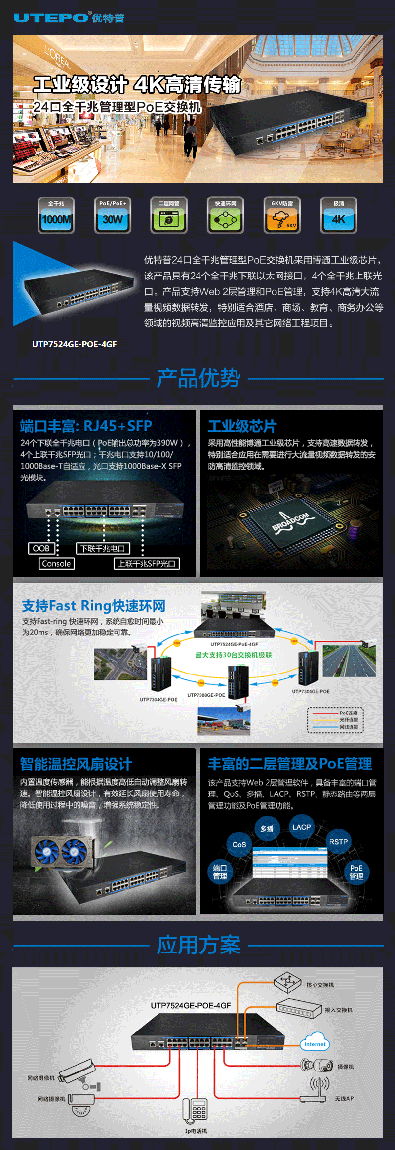 優(yōu)特普24口全千兆管理型PoE交換機采用博通工業(yè)級芯片,該產品具有24個全千兆下聯以太網接口,4個全千兆上聯光口。產品支持Web 2層管理和PoE管理,支持4K高清大流量視頻數據轉發(fā),特別適合酒店、商場、教育、商務辦公等領域的視頻高清監(jiān)控應用及其它網絡工程項目。