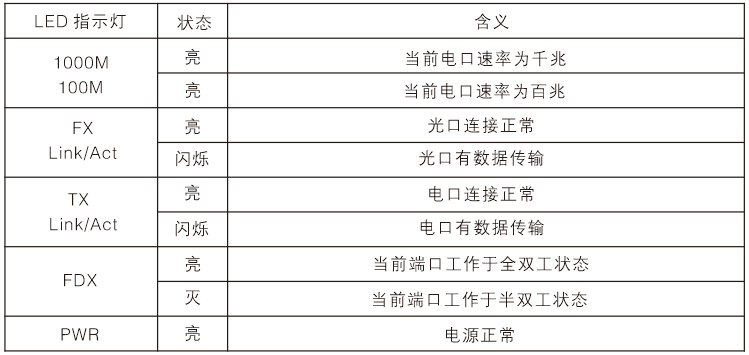 至于FDX全/半雙工模式指示燈、1000M和100M網(wǎng)絡(luò)速率指示燈是否常亮對光纖收發(fā)器沒有實(shí)質(zhì)影響。