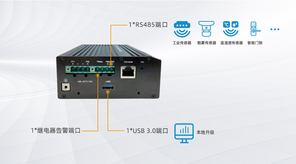 1*RS485端口:支持定制化服務(wù),可接入各種物聯(lián)網(wǎng)設(shè)備或作為串口服務(wù)器,如:工業(yè)傳感器、煙霧傳感器、溫濕度傳感器、智能門鎖等。支持Modbus協(xié)議轉(zhuǎn)換。