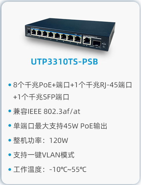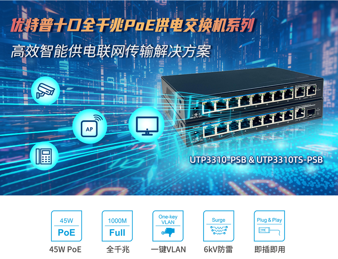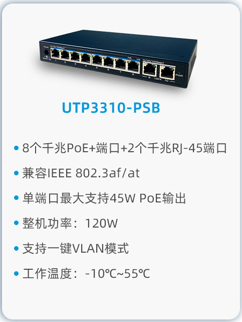 優(yōu)特普10口全千兆PoE交換機(jī)系列是具有高性能和可靠性的網(wǎng)絡(luò)交換機(jī),可為網(wǎng)絡(luò)設(shè)備提供穩(wěn)定的供電和數(shù)據(jù)傳輸質(zhì)量。其中UTP3310-PSB交換機(jī)可提供8個(gè)千兆R(shí)J-45以太網(wǎng)端口,2個(gè)千兆R(shí)J-45上聯(lián)以太網(wǎng)端口。UTP3310TS-PSB交換機(jī)可提供8個(gè)千兆R(shí)J-45以太網(wǎng)端口,1個(gè)千兆R(shí)J-45和1個(gè)千兆SFP上聯(lián)以太網(wǎng)端口。所有下聯(lián)端口兼容IEEE 802.3af/at PoE標(biāo)準(zhǔn),單端口具備提供高達(dá)45W的“高功率”供電能力,可滿足高功率需求的設(shè)備,如網(wǎng)關(guān)、無線AP等設(shè)備的供電需求。該系列交換機(jī)體積小巧、易于安裝,是滿足各種設(shè)備供電需求和網(wǎng)絡(luò)數(shù)據(jù)傳輸?shù)睦硐脒x擇,也是企業(yè)和機(jī)構(gòu)打造高效網(wǎng)絡(luò)的重要設(shè)備。
