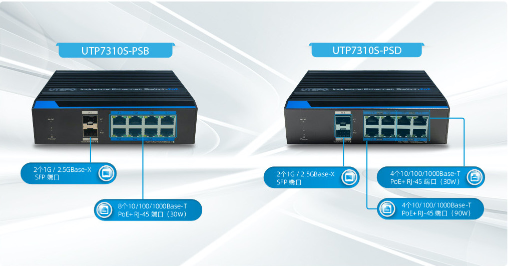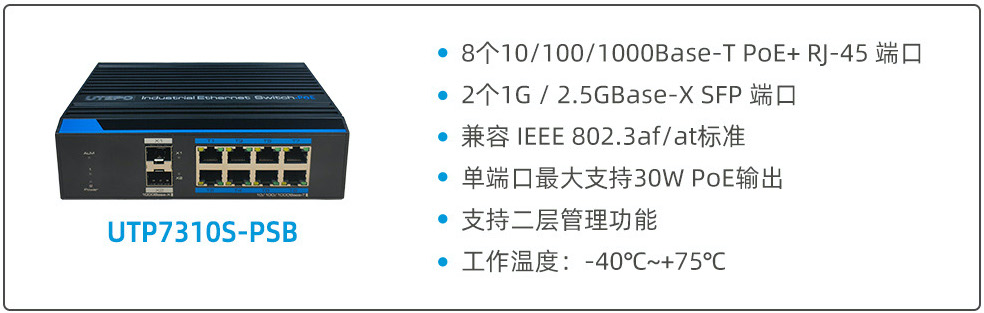 UTP7310S-PSB: 8個10/100/1000Base-T PoE+ RJ-45 端口 + 2個1G / 2.5GBase-X SFP 端口