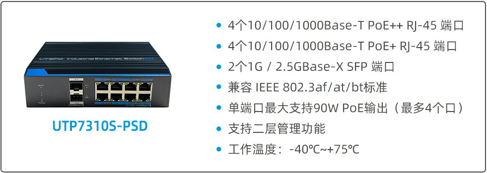 UTP7310S-PSD: 4個10/100/1000Base-T PoE++ RJ-45 端口 + 4個10/100/1000Base-T PoE+ RJ-45 端口 + 2個1G / 2.5GBase-X SFP 端口