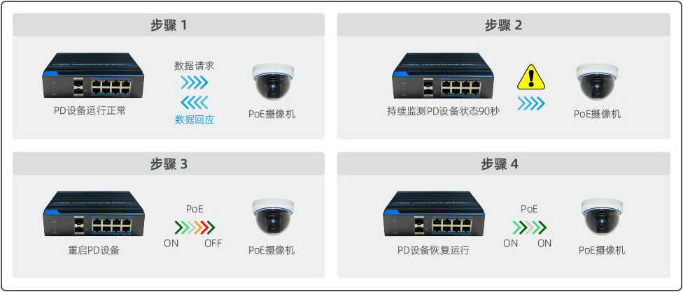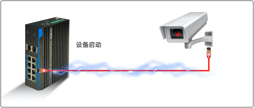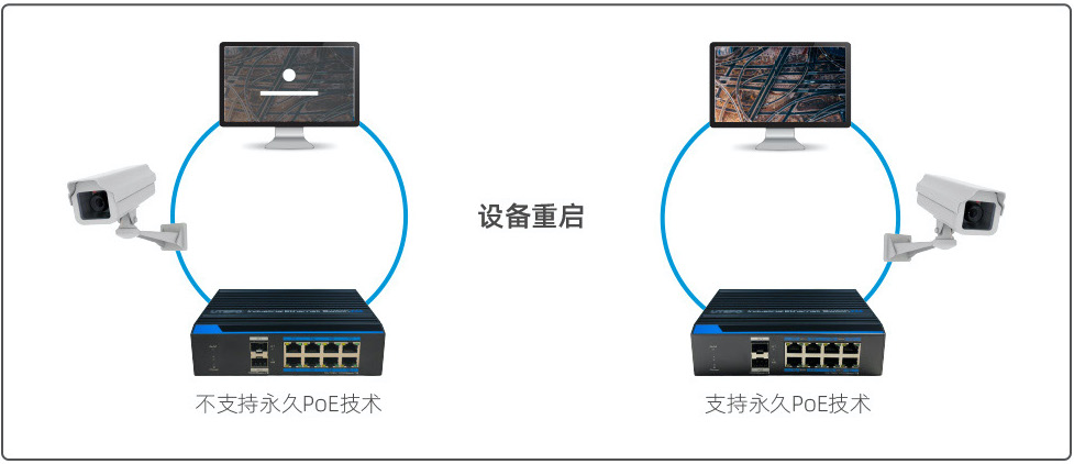 當(dāng)PoE交換機(jī)重啟時,永久PoE技術(shù)能為所連接的PD設(shè)備(PoE攝像機(jī)等)提供不間斷的電源。
