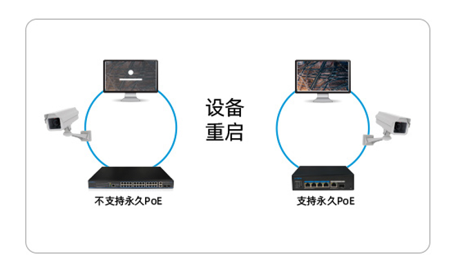 永久PoE技術(shù),當(dāng)PoE交換機(jī)重啟時(shí),永久PoE技術(shù)能為所連接的PD設(shè)備(PoE攝像機(jī)等)提供不間斷的電源。