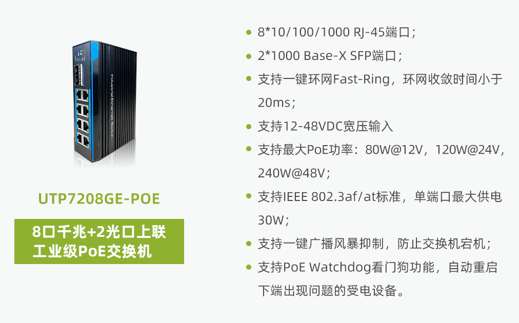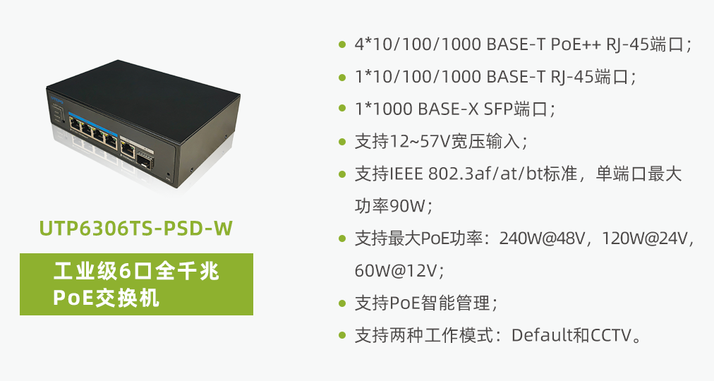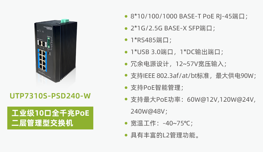 優(yōu)特普UTP7310S-PSD240-W 交換機支持PoE供電技術(shù),通過一根網(wǎng)線可以同時傳輸網(wǎng)絡(luò)數(shù)據(jù)和電源。減少了多根電源線的需求,簡化了安裝過程。