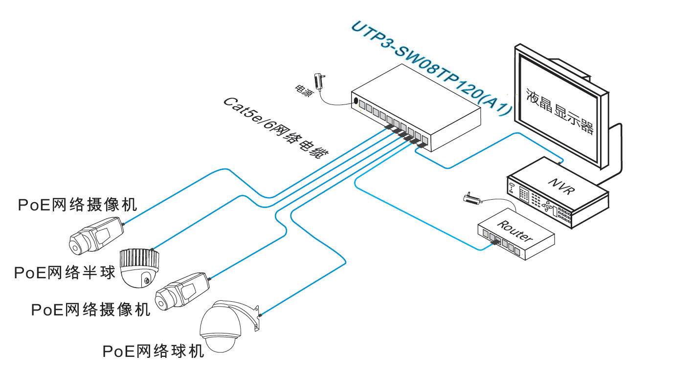 l UTP3-SW08-TP120-A1 8口百兆PoE交換機(8*百兆下聯(lián)PoE電口+2*千兆上聯(lián)電口) 該系列交換機所有下聯(lián)以太網(wǎng)RJ-45端口均支持以太網(wǎng)供電(PoE +),每個端口可提供高達30W的功率,符合IEEE 802.3af/at標(biāo)準(zhǔn)。 該系列交換機支持一鍵CCTV功能,可廣泛用于視頻安全監(jiān)控系統(tǒng)及網(wǎng)絡(luò)項目中。